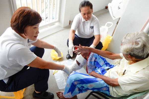 Nurse Nancy Tan (left) and Tzu Chi home care team members visit Salih’s (centre) home to clean his wound. (Photo by Bernard Ng)