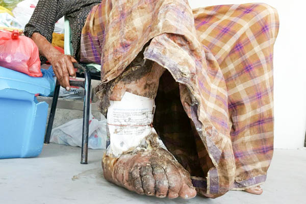 Before receiving medical attention from Tzu Chi, Salih’s leg oozed pus and he would use newspapers to wrap his sore. (Photo by Lim Kim Yan)