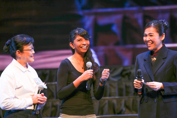 In January 2016, Titi (centre) shares Salih’s story during the Tzu Chi Year-End Blessing Ceremony. (Photo by Chua Teong Seng)