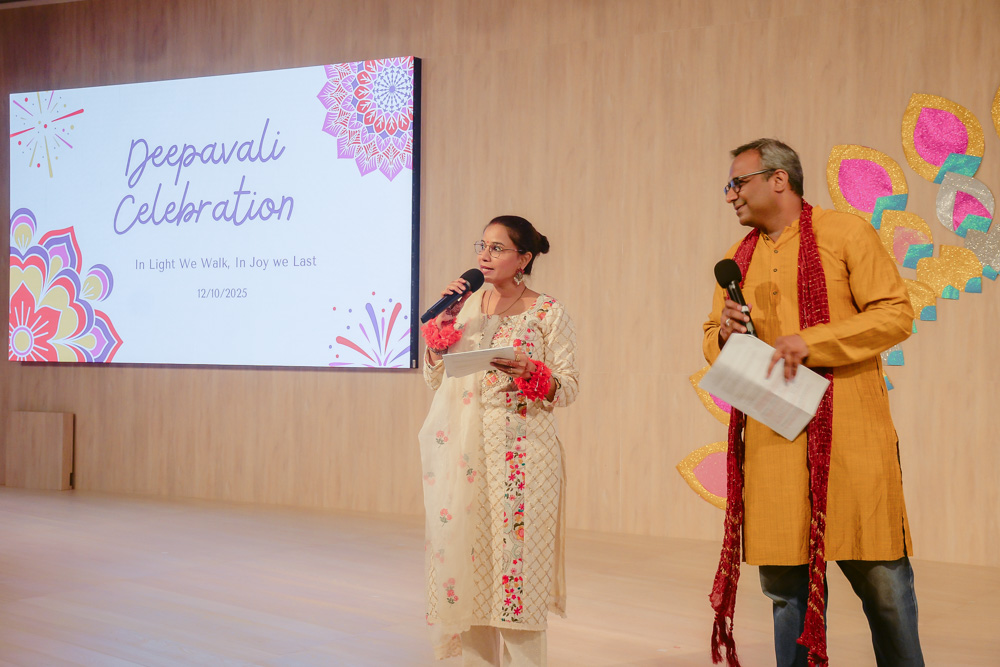 Nidhi (left) and her emcee friend, Sridhar (right), co-hosting the Deepavali Celebration event. (Photo by Chuah Chin Kah)