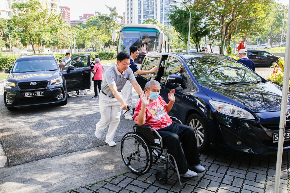 Home visit volunteers assisting care recipients with mobility issues into Jing Si Hall. (Photo by Foong Kwai Kin)