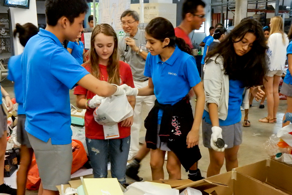 Volunteers let the student participants try sorting out recyclables with one hand so they can better appreciate and understand the importance of waste reduction. (Photo by Teh Siau Tong)