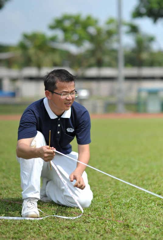林洋葆师兄是这次浴佛标兵组组长。彩排前,他和组员们都会先到现场,先量地再做记号。摄 / 王绥喜