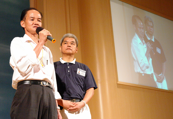 2006年9月30日,冠镇不幸车祸往生后的一个月,爸爸陈明福化悲恸为力量,圆满儿子生前的承诺,来到中秋发放日上台分享及鼓励病患。(摄 / 吴晓红)