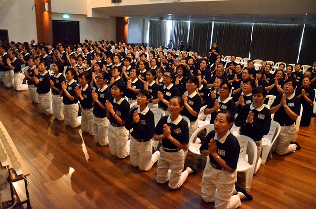 证严上人视讯连线开示结束,全体学员双手合十长跪唱诵《立愿文》恭送上人。 (摄 / 刘素方)
