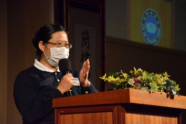 南三互爱慈善干事张爱萍在课程《从竹筒岁月到国际NGO》中,阐述上人的理念「信己无私,信人有爱」 ,相信普天下人人有爱心,人人都是善的种子。 (摄 / 刘素方)