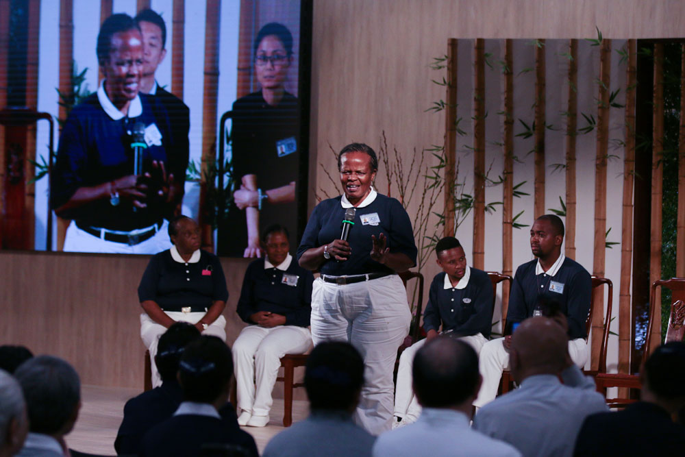 南非慈济前执行长潘明水(济赢)在场引荐南非志工与大家做心得分享。第一位授证的非洲本土委员慈蒂(Gladys Ngema)说:“如果没净化人心,我们将永无宁静,动乱不止。”二十多年前屋子被纵火烧毁,在最无助时得到慈济的援助,潘明水教导她放下仇恨并一起当救人的天使,十年的付出终于让慈蒂感到释怀,同时让善与爱相续不断。