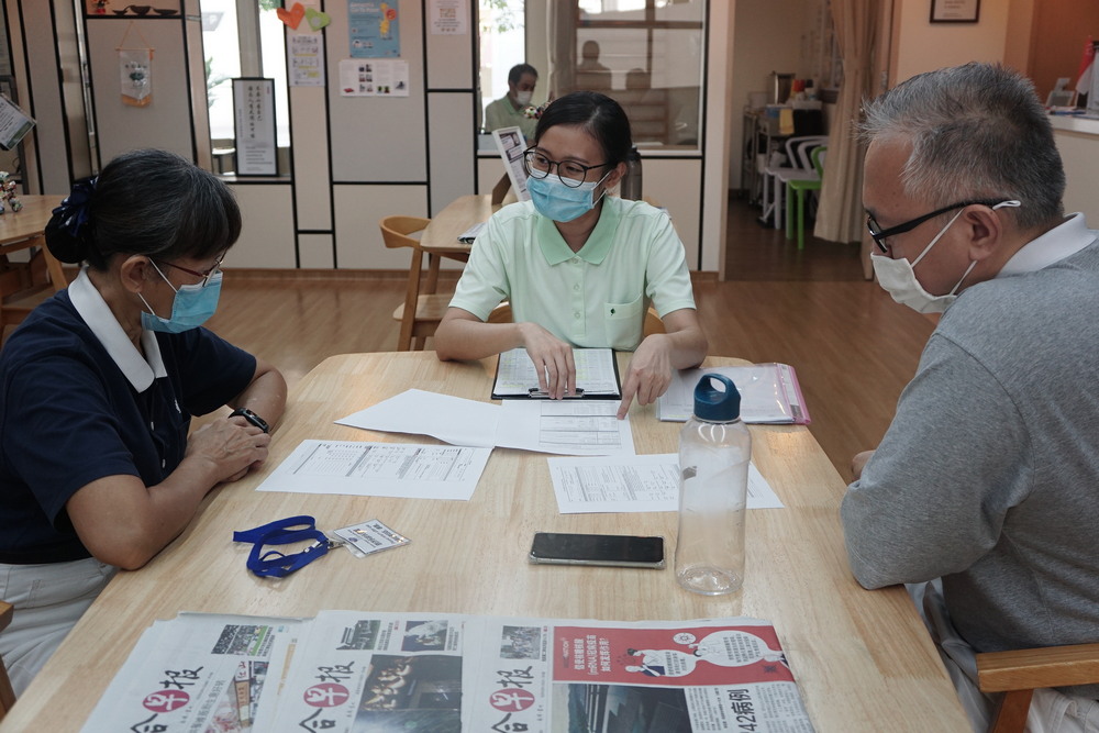 甘玉珍(蓝衣)与两名长青馆职工(右为傅思宜)正在协助一名长者填写卫生部的问卷。(摄 / 吴佳翰)