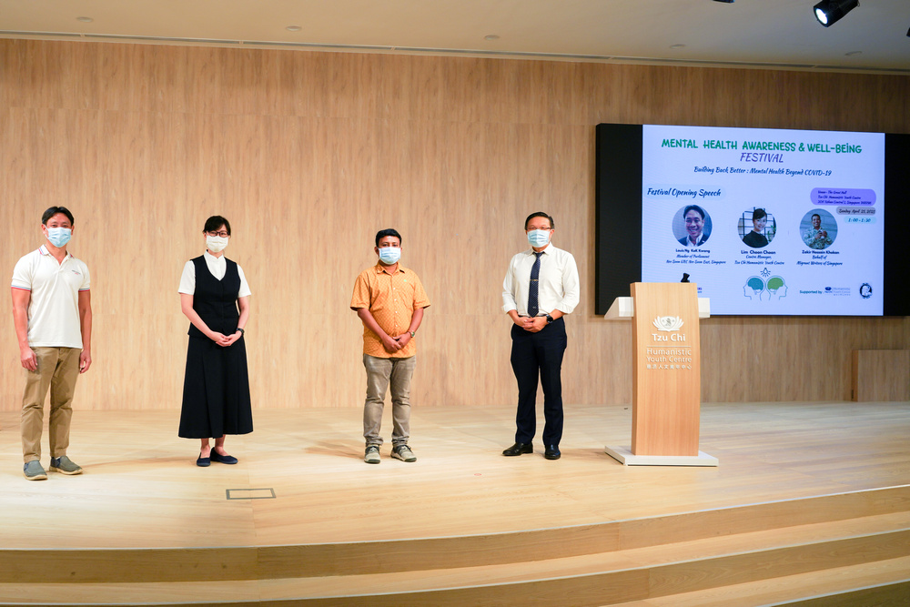 2021年4月25日,外劳作家协会主办首届心理卫生日,青年中心免费提供场地。由左至右:义顺集选区国会议员黄国光、青年中心经理林杏纯、外劳作家学会创办人扎基尔和慈济医发处主任林文豪医师。(摄 / 曾美珍)