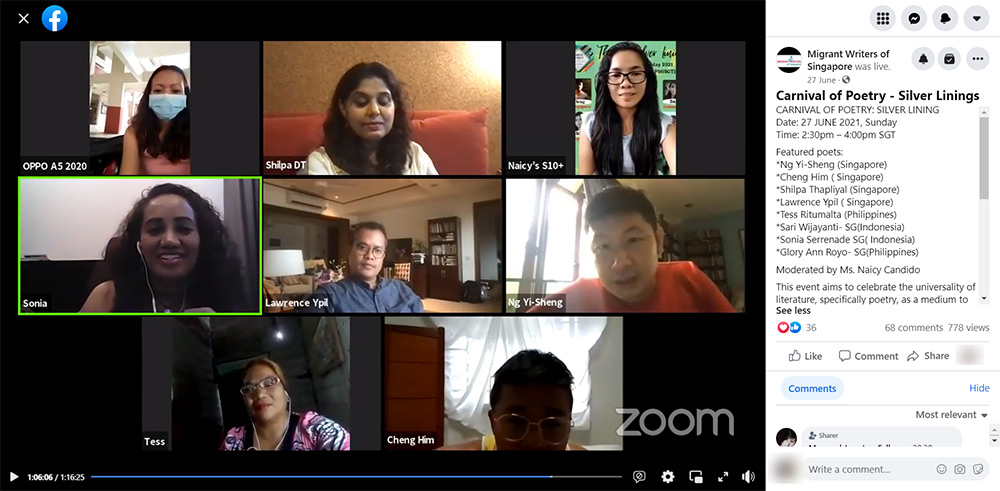 外劳作家协会也承担了两场线上诗歌欣赏活动。分享者除了来自新加坡文学爱好者,也有旅新的菲律宾、印尼、孟加拉等同好。这些在新加坡工作的客工,在周末经常以文学相会,即使是疫情期间,也经常举办线上活动。此次透过人力部的推广,盼能接触到更多的潜在受众。