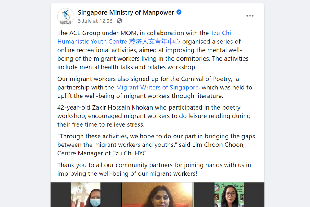 新加坡人力部于7月2日于脸书发文,感谢青年中心、外劳作家协会等公益组织一同关心宿舍客工的身心健康。(截图 /吴佳翰)