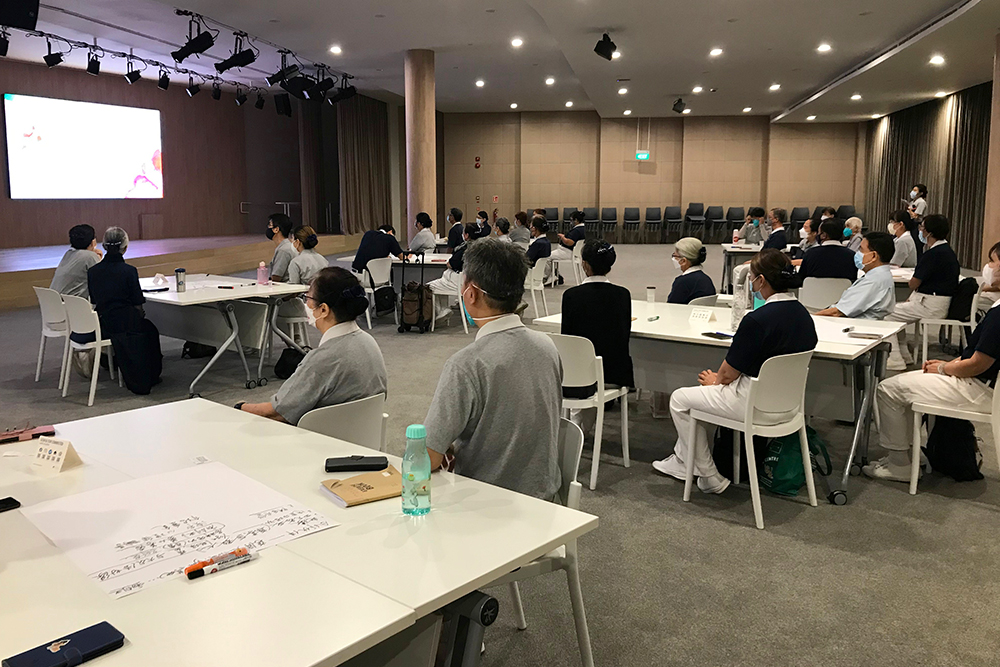38名接待组志工欢喜相聚在礼堂,联络情感,也不忘共同精进,进一步了解青年中心的运作,以及接待组志工所应扮演的角色。