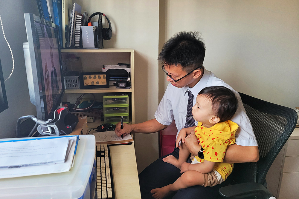 为期两天的四合一合心共识营,不少志工在各自的家中自行连线上课,学员许伟倡一手抱着宝宝,一边听课做笔记。(摄/ 沈立为)