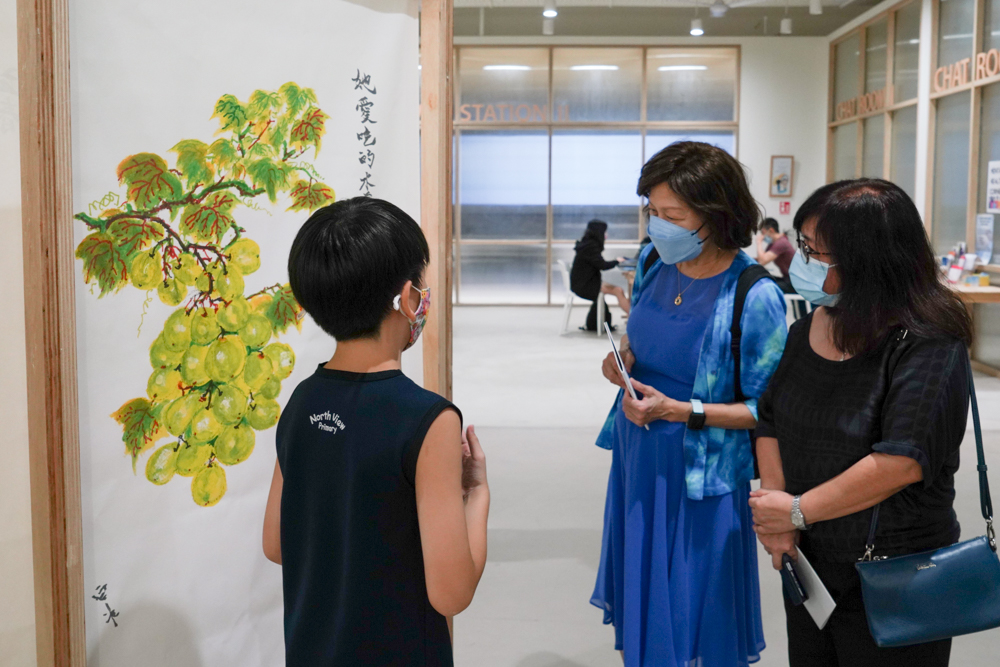 当日亦恰逢伴学计划“快乐天堂”(Kidz Hideout)学童到青年中心上课,学童在慈济志工陪伴下承担“一日推广大使”,为观展公众介绍画作背后的故事和寓意。“快乐天堂”是青年中心和教育部在去年开展的一项课后伴学趣合作计划,旨在透过长期陪伴, 帮助失能家庭中的孩子找到依靠。