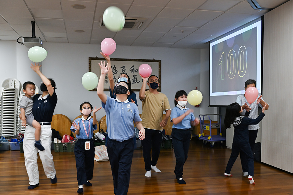 教室传出阵阵欢呼声,孩子和家长互相接力,在不用手掌的情况下,把气球在最短时间传到终点。(摄/ 黄建兴)