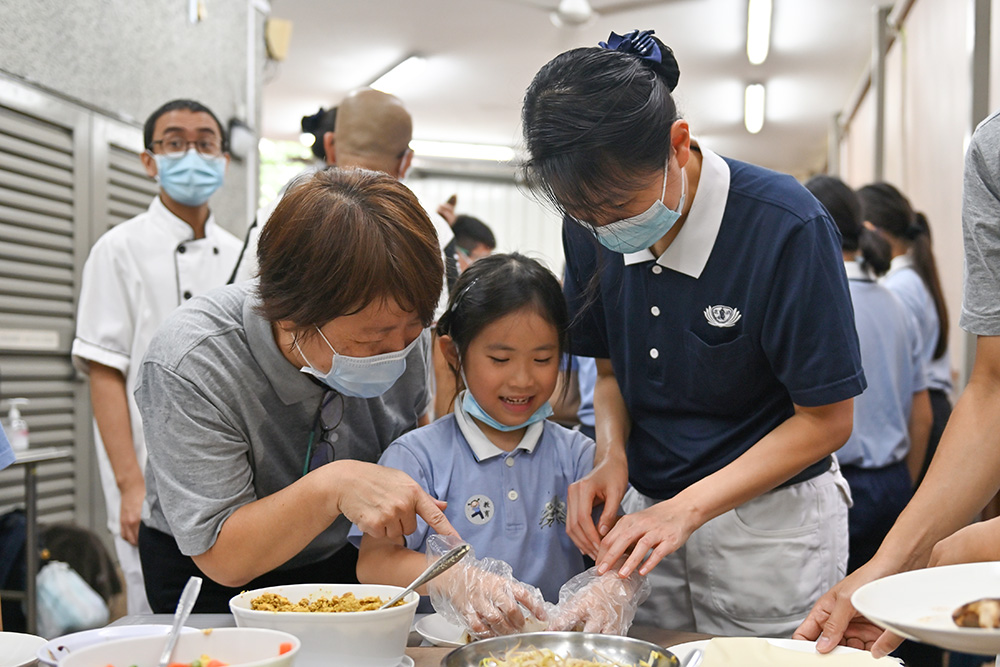 同时,另一端的斋堂飘来菜香,大家围在圆桌,一起包薄饼,一些孩子和家长动作比较生疏,经过一番尝试和努力后,品相不甚完美,但亲手制作更觉得美味可口。