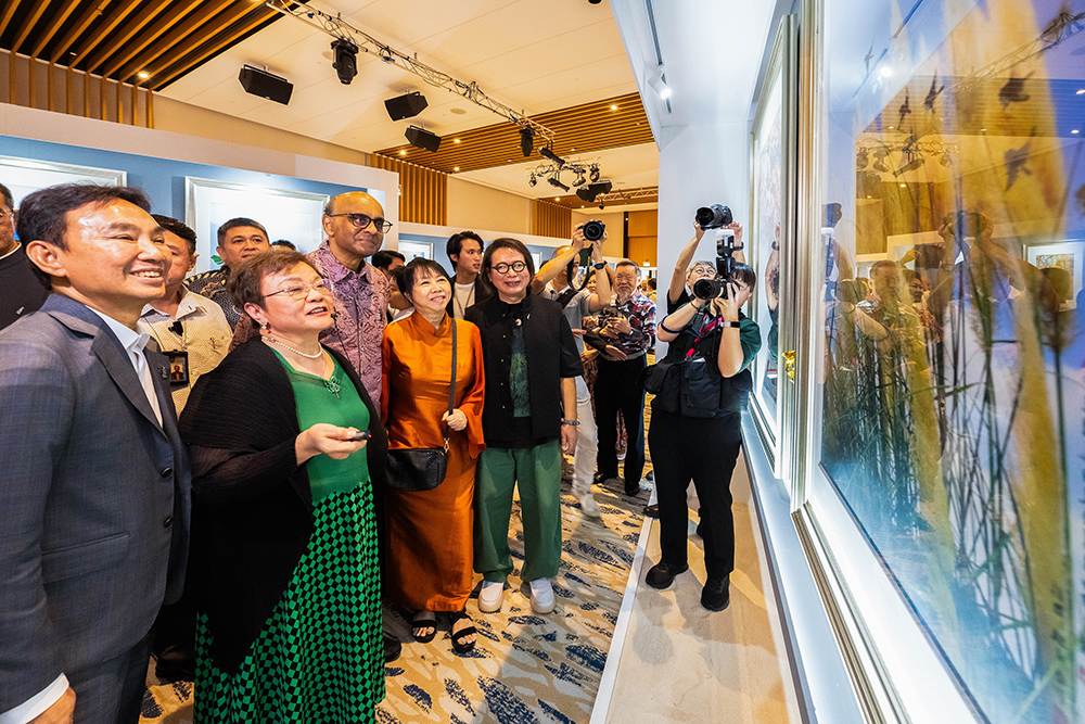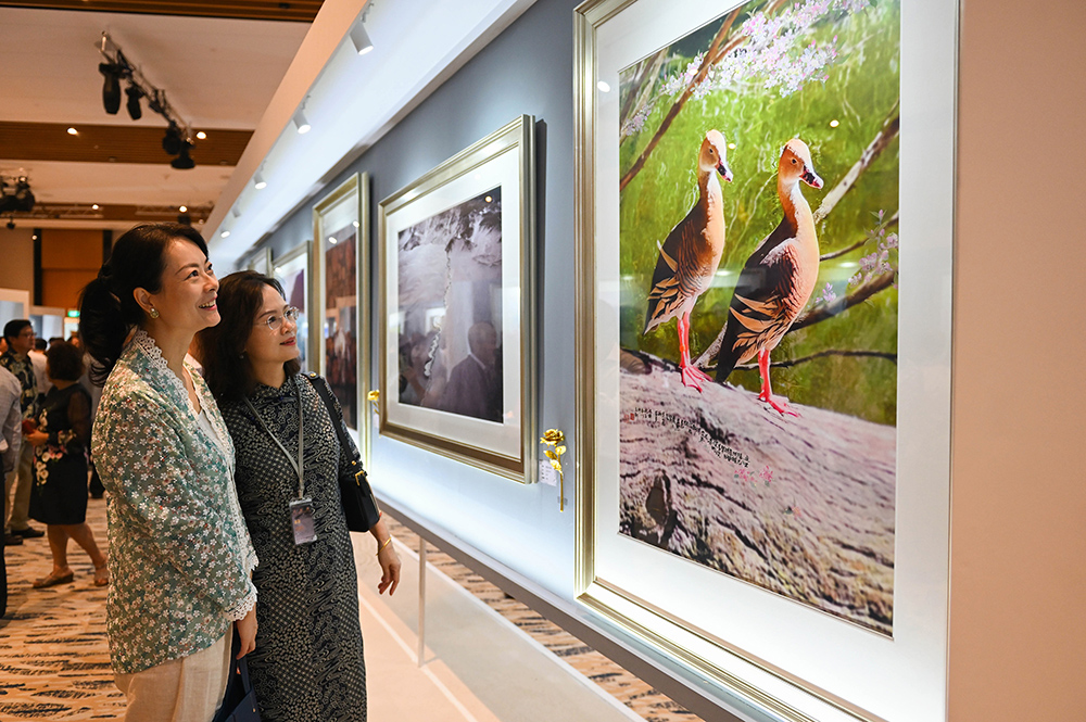 揭幕仪式后,总统尚达曼(左三)与夫人珍一藤木女士欣赏摄影画展作品。(摄/ 陈清华)