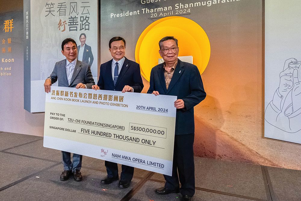 CK集团创办人兼主席洪振群(左)颁赠支票给慈济基金会(新加坡)执行长刘瑞士(中),右为南华潮剧社社长卓林茂。(摄/ 陈清华)